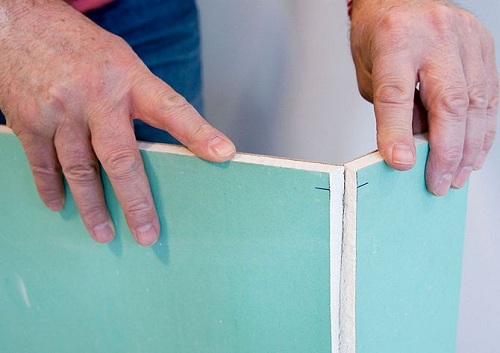 Лист надламывают, сдвинув его так, чтобы он нависал над полом, затем переворачивают и разрезают картон на обороте. Если нужен кусок в форме буквы Г, то короткий рез выполняют ножовкой, длинный ножом. Криволинейные разрезы делают электролобзиком. Отверстия под розетки и т. п. выполняют до крепления листа к обрешетке — прямоугольные ножом, круглые дрелью с коронкой по гипсокартону.