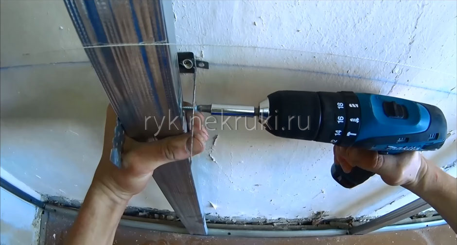 После того как стоечные профили установлены, натянем капроновую нитку и выставим их по плоскости. Для этого берем монтажку (саморез с пресс шайбой, 4.2×13 мм без сверла), приставляем к профилю и вкручиваем в профиль не до конца: