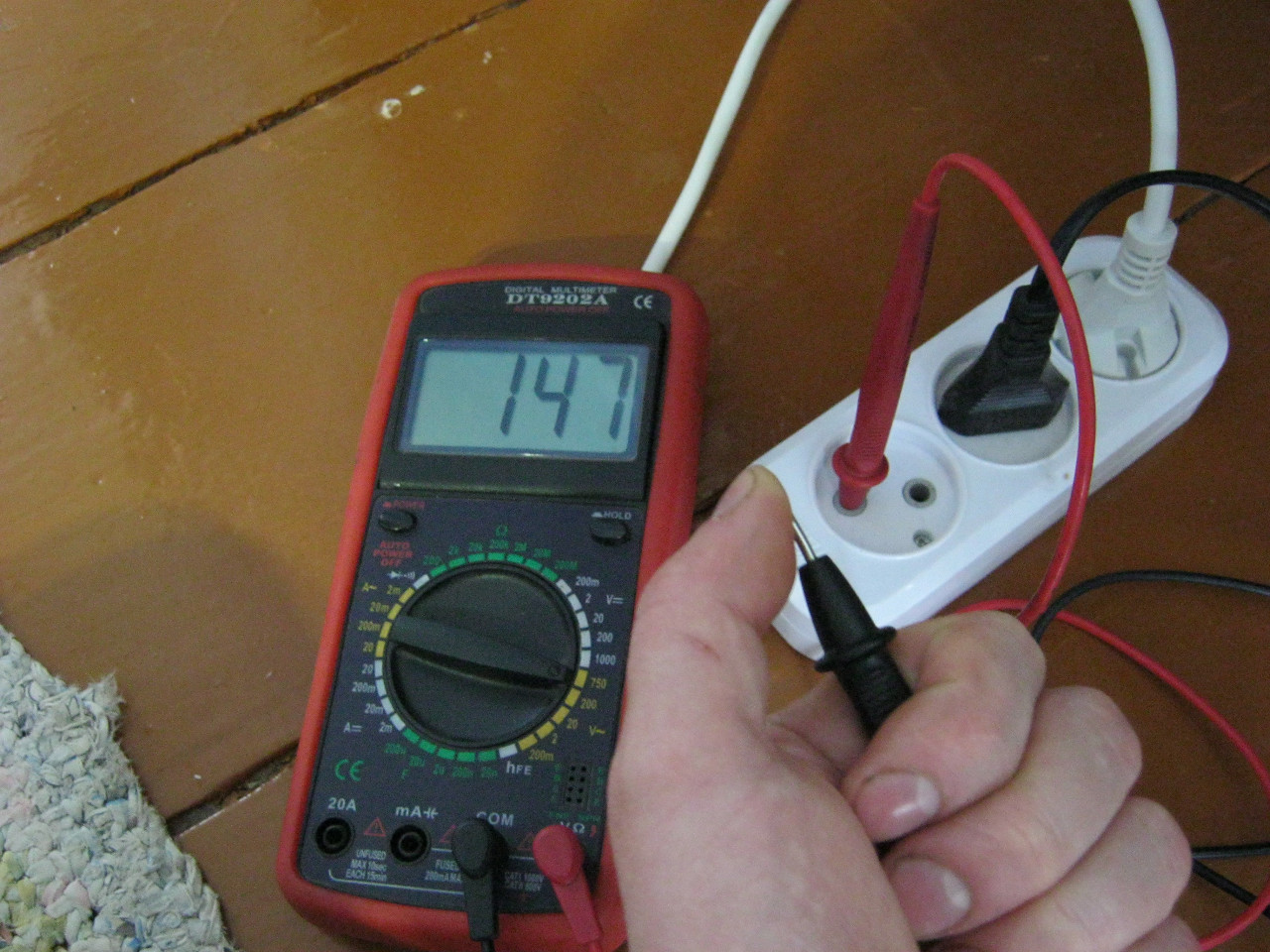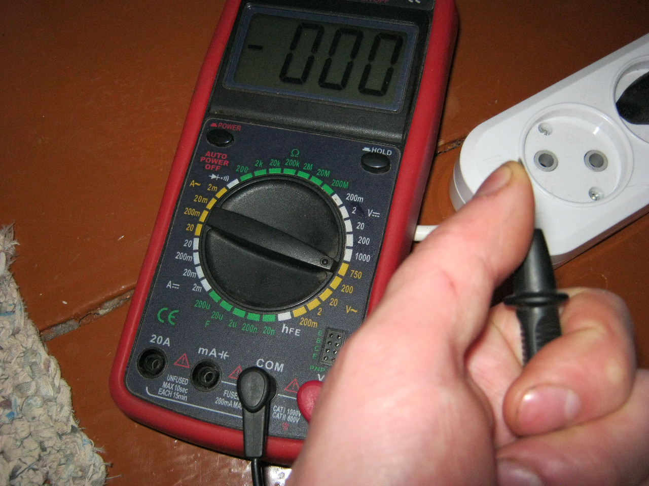 Второй щуп втыкаем в розетку и смотрим, что у нас мультиметр покажет на дисплее. Если мы касаемся нуля, то на дисплее мультиметра высветятся нули или несколько вольт. Если касаемся фазы, то на дисплее мультиметра появится приличное напряжение – это и есть фаза.