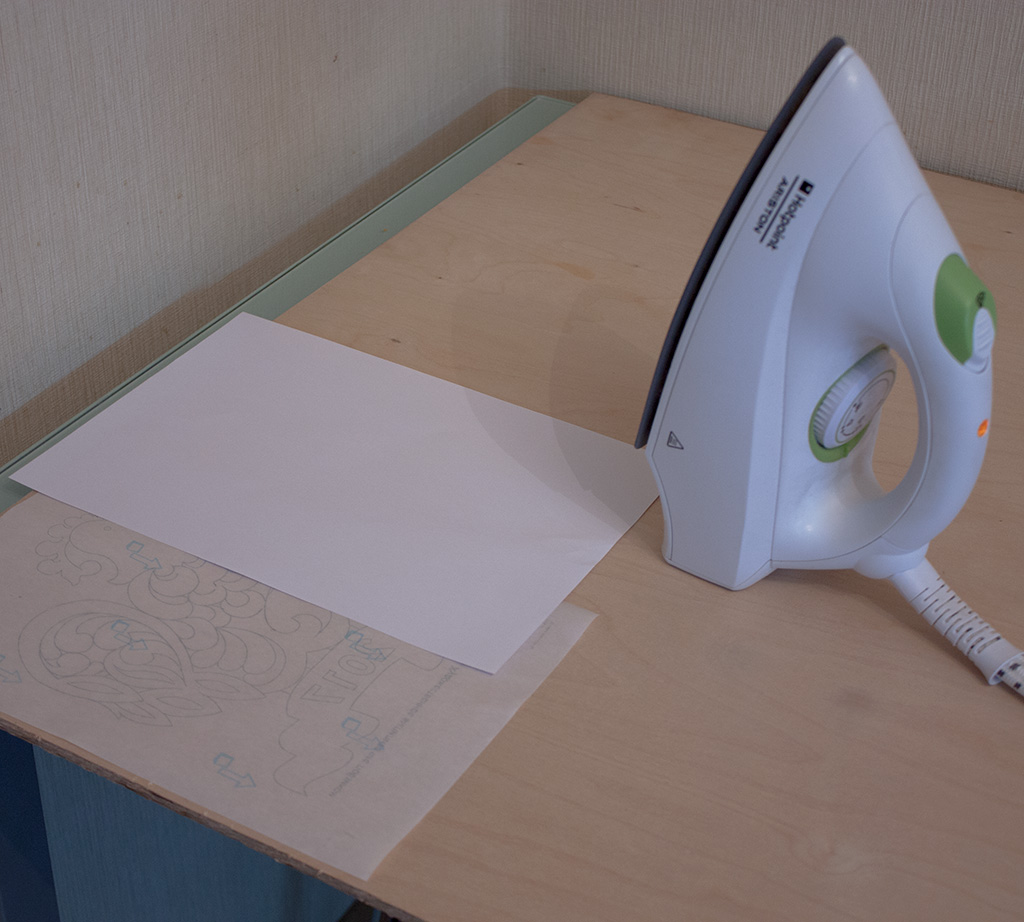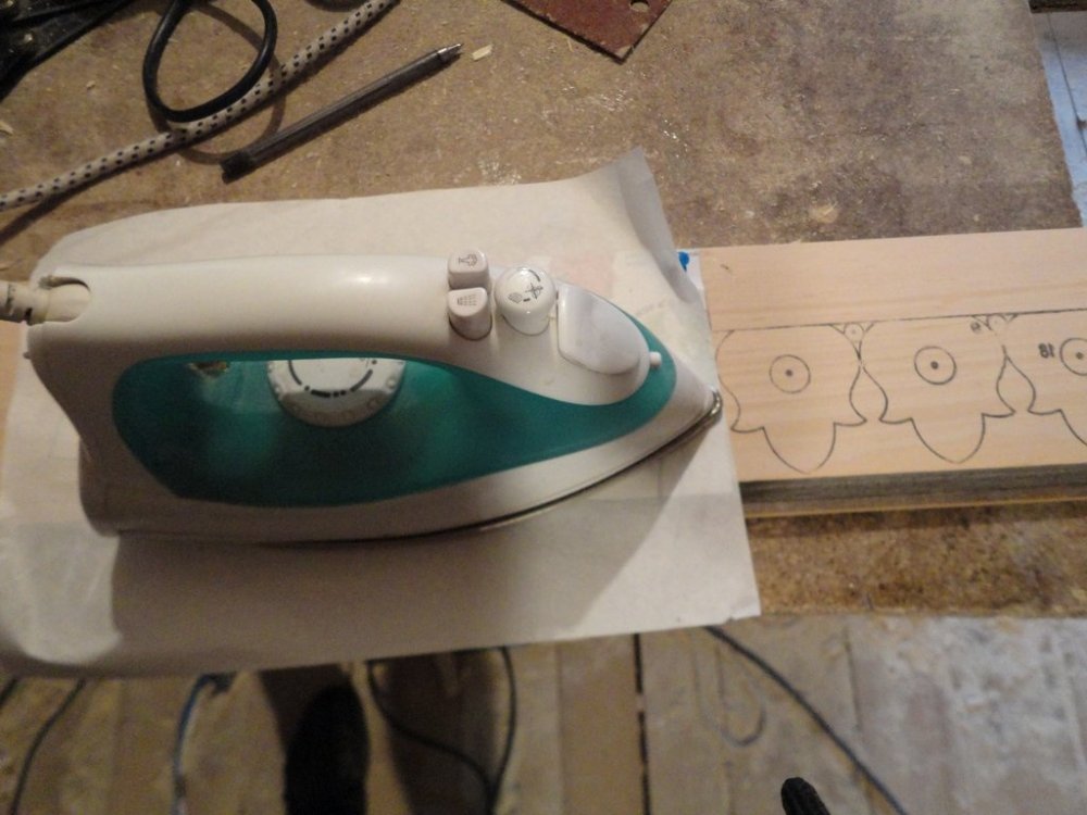 Затем просто кладете трафарет на доску и через лист чистой бумаги (допустим, кальки) проглаживаете утюгом.