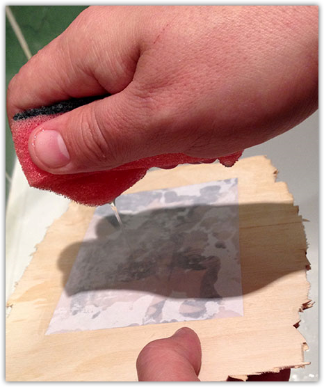 9. Остатки бумаги аккуратно удалите с дерева губкой. Будьте осторожны, не переусердствуйте, иначе рискуете случайно удалить часть изображения. Но момент этот почти волшебный – наблюдать, как ваш снимок во всей своей неотразимости проявляется на деревянной основе.