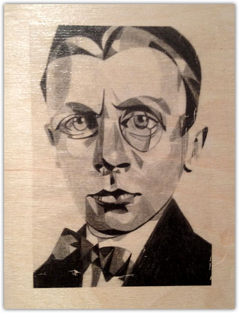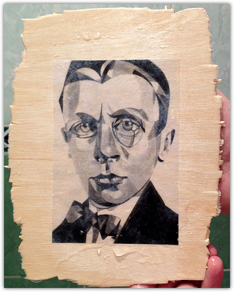 Обрезаем картинку по нужному размеру. Старайтесь меньше прикасаться руками к рисунку, чтобы не оставить жировых отпечатков. Я взял, портрет Михаила Афанасьевича Булгакова, отобразил зеркально в редакторе и распечатал на обычном лазерном принтере. Фанерку хорошенько отшлифовал, очистил от пыли.