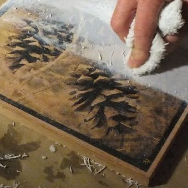 Для этого мастер-класса вам нужно выбрать рисунки или фотографии, которые гармонично будут выглядеть на обработанной деревянной поверхности. Мы для примера взяли картинку с сосновыми шишками и распечатали ее на лазерном принтере.