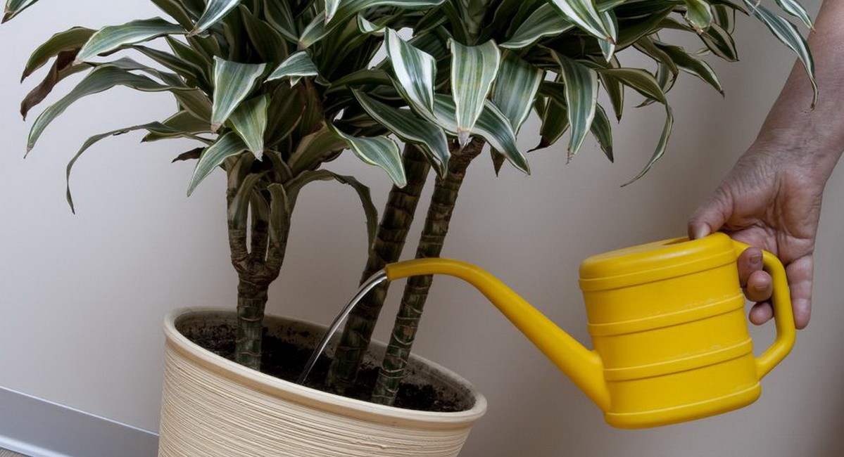 - Водные процедуры. Растению не по душе наши радиаторы. Поэтому зимой, когда батареи сушат воздух, опрыскивайте кустик дважды в день. Вода должна быть комнатной температуры. Кстати, драцена не обидится, если вы будете опрыскивать ее и летом тоже. Также можете носить ее в ванну и ставить под теплый душ.