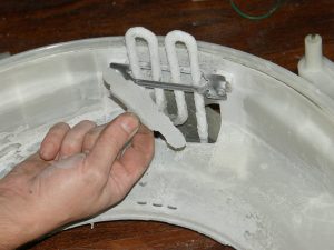 В стиральных машинках накипь скапливается в основном на ТЭНе. Из-за этого нагревательная деталь начинает неправильно работать, подогрев воды до заданной температуры происходит дольше, и спустя некоторое время элемент просто выходит из строя