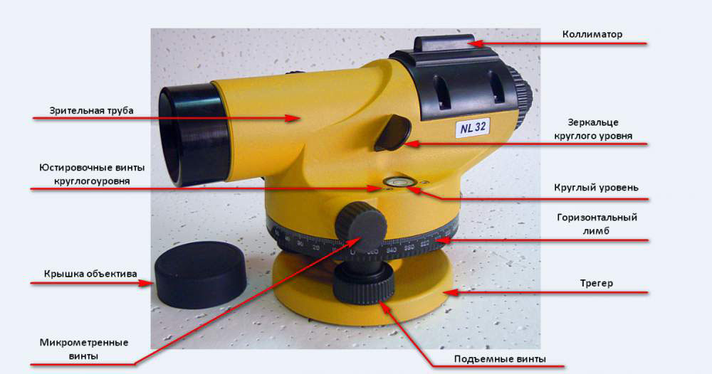 Оптические или призменные нивелиры используются профессионалами чаще всего. Они представляют собой прибор, который состоит из основного блока и подставки (триггера). Рассмотрим, из каких элементов он состоит.