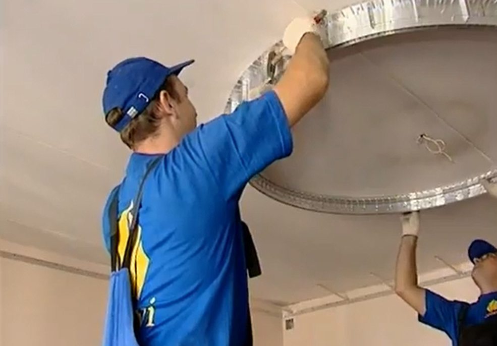 - После его остывания, когда оно приобретает требуемую эластичность, приступают к установке люстры. На ощупь отыскивают отверстие для проводов и вокруг этого места приклеивают монтажное кольцо. Потом внутри его вырезают материал и посредством отверстия выводят провода.