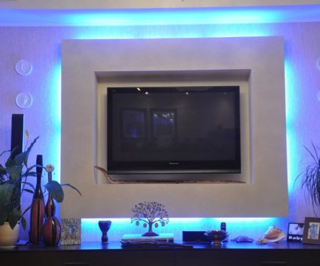 После установки и обделке каркаса приступают к установке осветительных приборов. Кроме точечных осветительных приборов, многие мастера используют более практичную и долговечную LED ленту. С её помощью можно сделать не только приглушенную подсветку, но и скомбинировать цвета. Ниша для телевизора из гипсокартона с такой подсветкой сделает интерьер комнаты интереснее и уютнее.