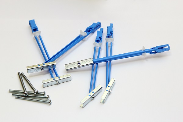 Дюбель «Хартмут» (Knauf Hartmut). Специальный элемент крепления, предназначенный для пустотелых конструкций. В состав крепежа входит П-образная якорная планка, выполненная из оцинкованного стального профиля, двух направляющих пластиковых элементов (голубого цвета), втулки запирающей (бесцветный пластик) и винта М5 (60 мм). Отличительная особенность дюбеля – высокие показатели несущей способности: один узел может нести нагрузку для стен до 55 кг или 6 кг на один элемент для потолка или пролетный 1 погонный метр. «Хартмут» отлично зарекомендовал себя при монтаже тяжелой мебели, громоздких телевизоров и т.д.