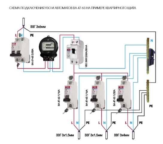 - при монтаже УЗО разделяются нулевой защитный (РЕ – линии черного цвета) и нулевой рабочий проводник (N – линии голубого цвета);