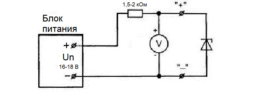 Для тестирования стабилитрона понадобится блок питания, резистор и мультиметр. Соединяем резистор с анодом стабилитрона, через блок питания подаем напряжение на резистор и катод стабилитрона, плавно поднимая его.