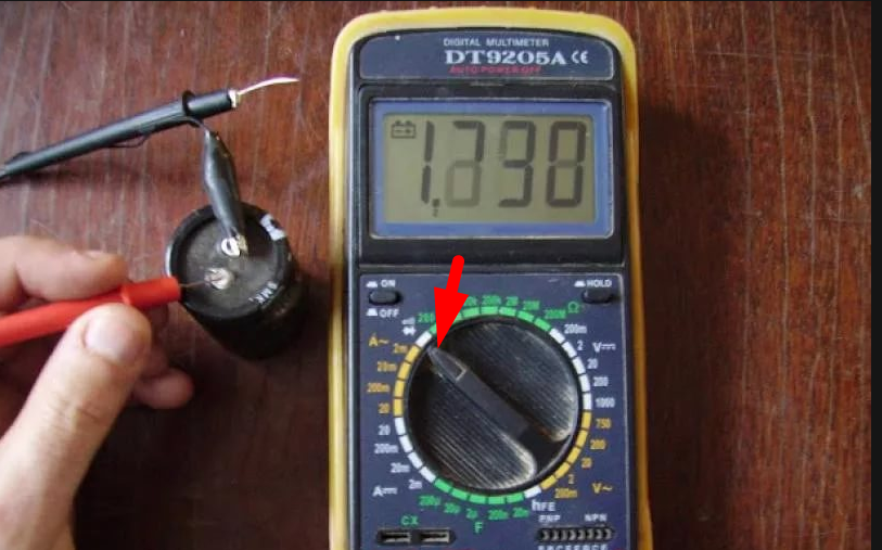 При помощи мультиметра проверяют два параметра конденсатора: внутреннее сопротивление и емкость.
