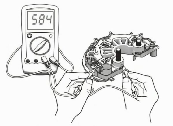 Существует еще один метод проверки генератора мультиметром. В этом случае используется сопротивление – основная физическая величина. Для проведения измерений таким способом, переключатель нужно установить на отметку 1кОм. Касания щупами осуществляются как и в предыдущем варианте. При проверке одного направления прибор должен выдавать результат 500-800 Ом, а при проверке другого – бесконечность. В этом случае все диоды моста находятся в рабочем состоянии.