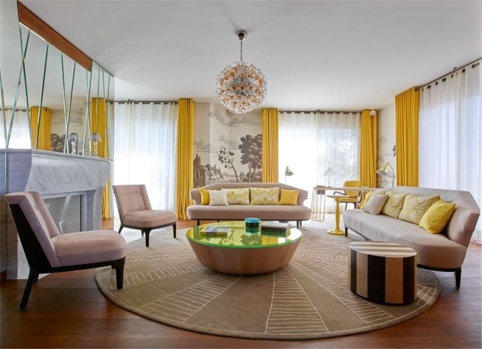 Как и в первом варианте, здесь сначала необходимо установить центральную фигуру интерьера. В этом способе его роль чаще всего отдается журнальному столику в центре либо красивой большой люстре. Как и в симметричном варианте, все предметы нужно расставлять на одинаковом расстоянии от центральной фигуры. Единственное требование – все должно стоять по кругу. Из-за этого вариант считается более сложным в исполнении, чем предыдущие.