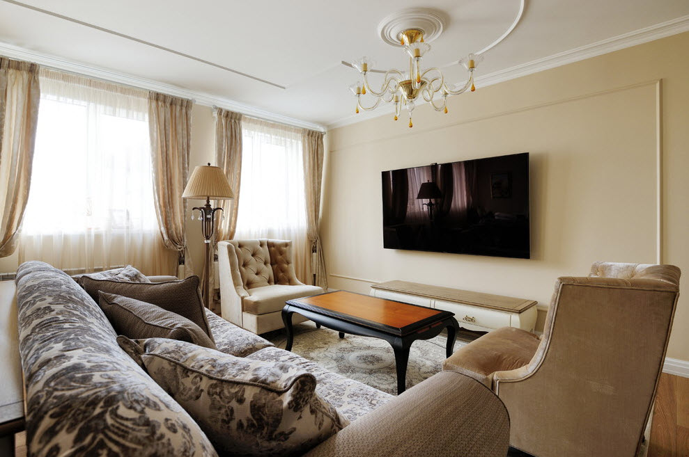 Чаще всего такой способ расстановки рекомендуется использовать тем, кто желает иметь классический интерьер в своей гостиной. Его особенность — все предметы выдержаны в едином стиле, а стоящие симметрично имеют одинаковый размер и цвет.