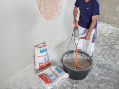 В емкость заливают 80-90% приготовленной для замеса воды, засыпают «Ротбанд», выжидают 1-2 минуты, пока он начнет впитывать в себя влагу, а затем начинают размешивать миксером, постепенно доливая остаток воды до получения необходимой консистенции смеси. Готовую штукатурку оставляют настояться еще на несколько минут, после чего начинают наносить на стены.