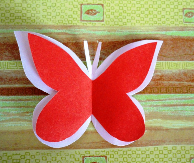- Полученному изделию дорисовываем недостающие элементы: усики, тело. Их можно вырезать из отдельного листа и приклеить. Аккуратно выгибаем крылья.