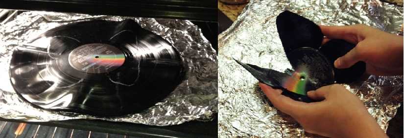 На винил при помощи мела наносится контур, пластинка ставится в разогретую духовку, как только начинает размягчаться, вынимается, ножницами быстро вырезаем по контуру. Часто греть «заготовку» приходится несколько раз. После того как вырезали, греем последний раз и придаем желаемую форму.
