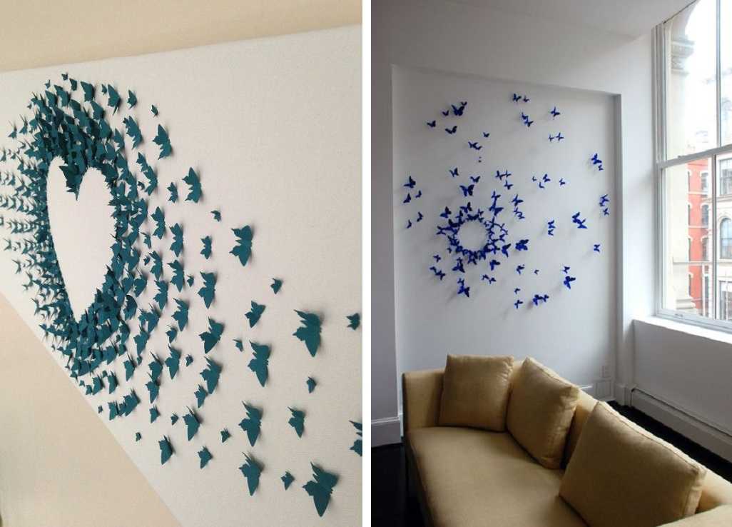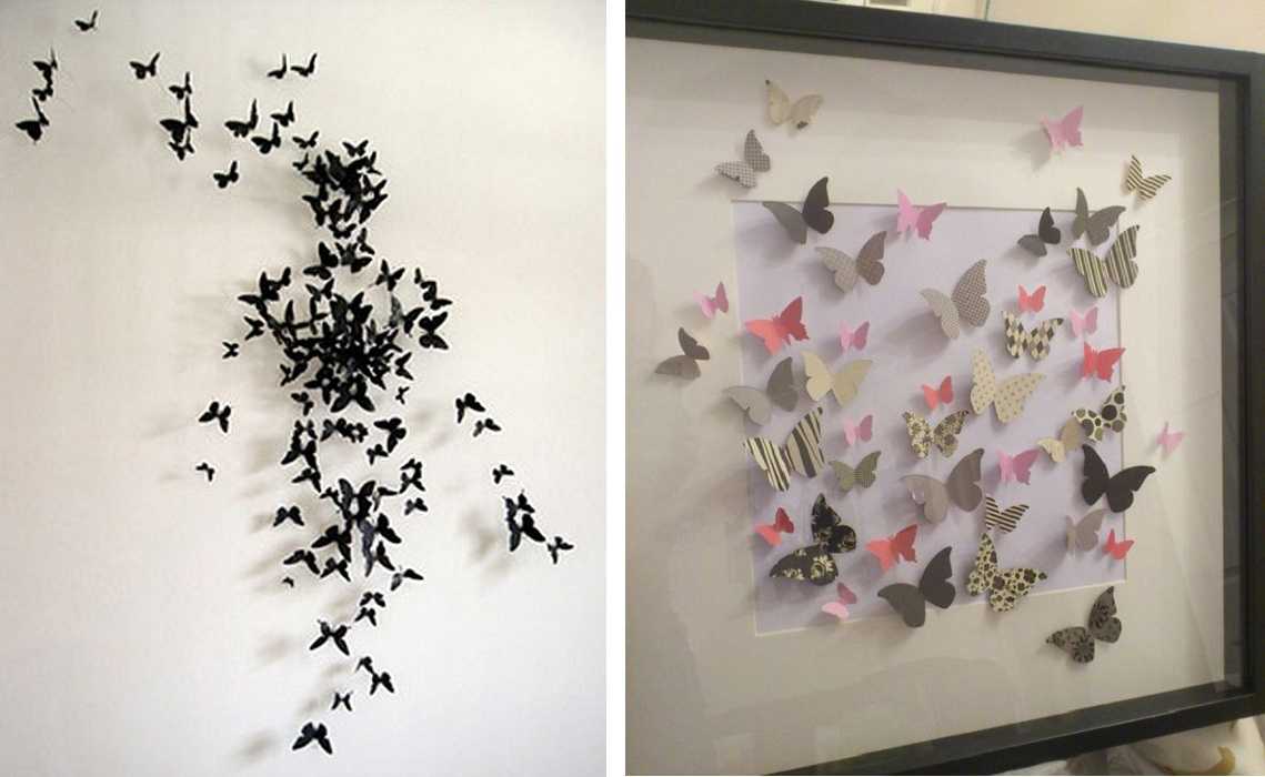 И несколько настенных композиций, в которых использованы бабочки для декора, сделанные из разных видов бумаги.