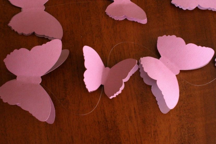 - Вырежьте еще такую же деталь, поменьше – подкрылки. Соедините обе части нитками, на месте головы приделайте узкие полоски из бумаги – усики. Смастерите несколько бабочек, закрепите их на резинке и украсьте такой гирляндой детскую комнату или сделайте подвеску к кроватке малыша.