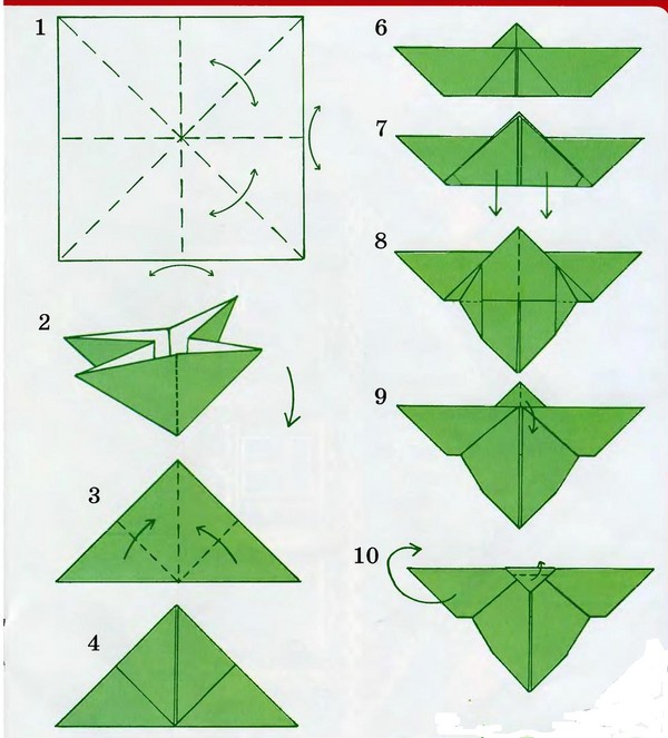 - Разверните заготовку. Получившийся ромб сложите гармошкой, которую примните в середине. У вас образовались сборки справа и слева – это крылышки.