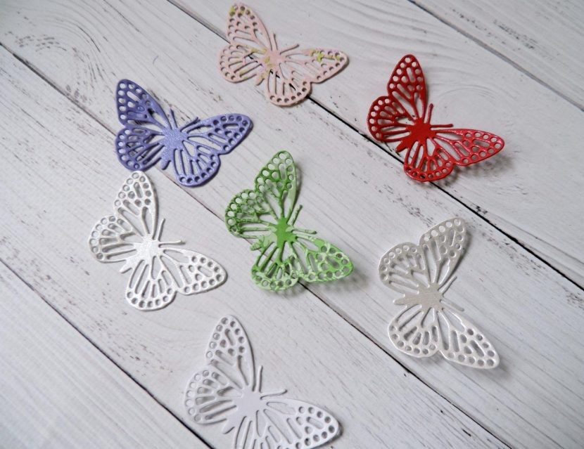 Также из картона проще делать ажурных бабочек. Имея достаточно острый нож вырезают «лишнее» оставляя только перегородки. Такие украшения требуют усидчивости, большого терпения и аккуратности.