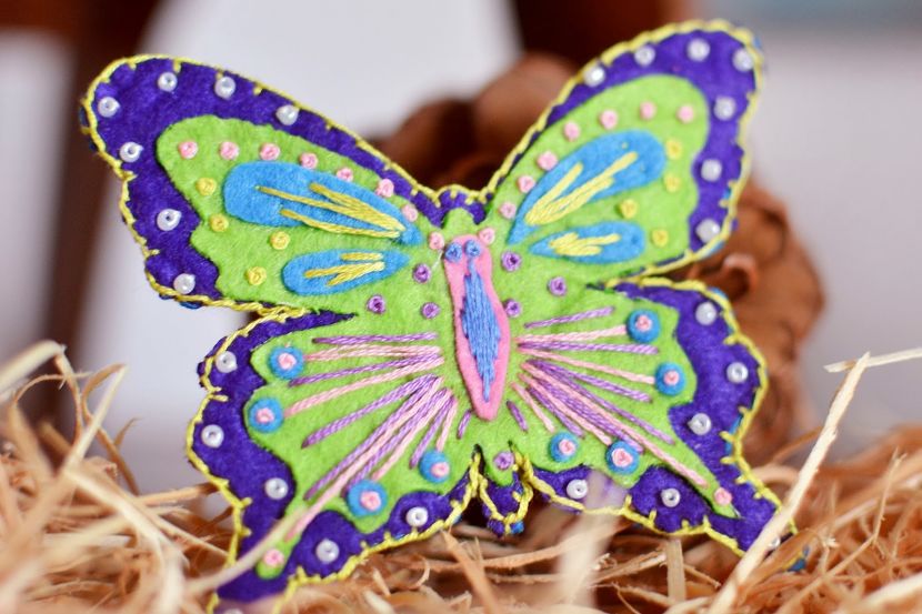 Проволочные держатели. Специального крепежа,чтобы сшить бабочку своими руками, покупать не потребуется, если проявить фантазию и сделать его самостоятельно в виде ног насекомого. Через брюшко пропускается несколько витков проволоки, которые затем разрезаются вдоль, отгибаются и при фиксации скрепляются плотно на ткани. Есть минус – при частом отгибе проволока ломается, но это поправимый дефект – ноги изготавливаются снова, а когда ребенок наиграется, снимать бабочку придется редко. Этот декор противопоказан для детей младшего возраста – до полутора лет. Мелкие детали станут причиной попадания в дыхательные пути малыша.