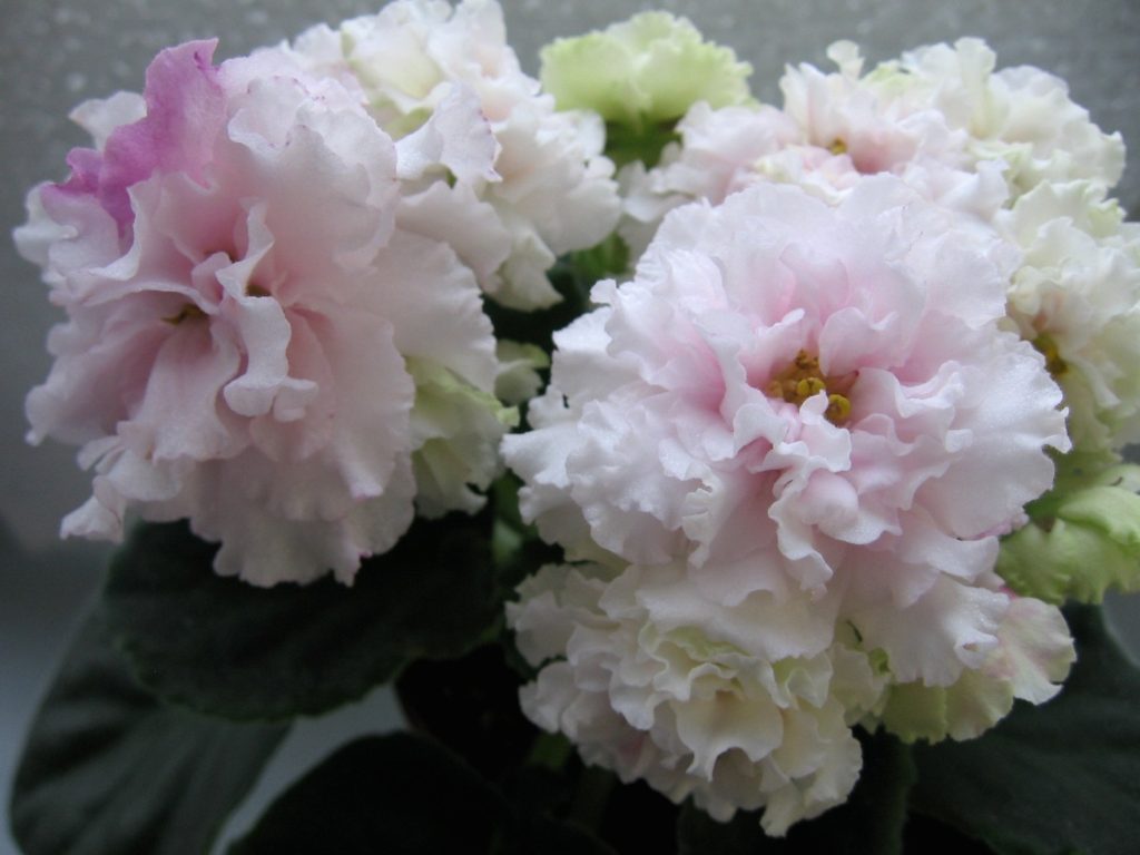 Бело-розовые полумахровые цветки с гофрированными краями. Листья светлого зеленого оттенка с удлиненными черешками. Если температура окружающей среды повышается, розовый оттенок исчезает из окраса – цветы становятся белыми.