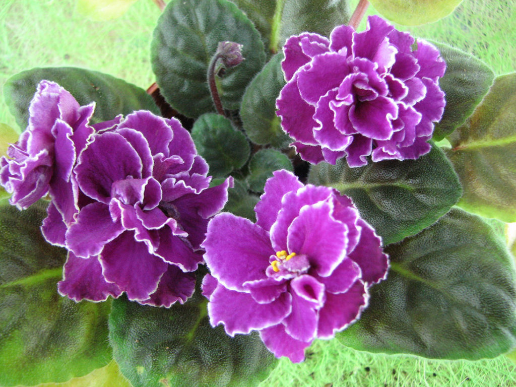 Фиолетовые махровые сенполии с белой окантовкой по лепесткам. Розетка крупная, состоит из темно-зеленых листьев.