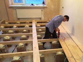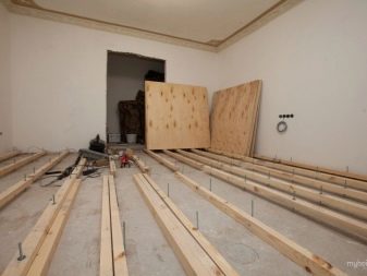 - На полу монтируются лаги из древесины (доски, брусья толщиной 4 см). К основанию их следует фиксировать саморезами либо дюбелями и металлическими уголками.
