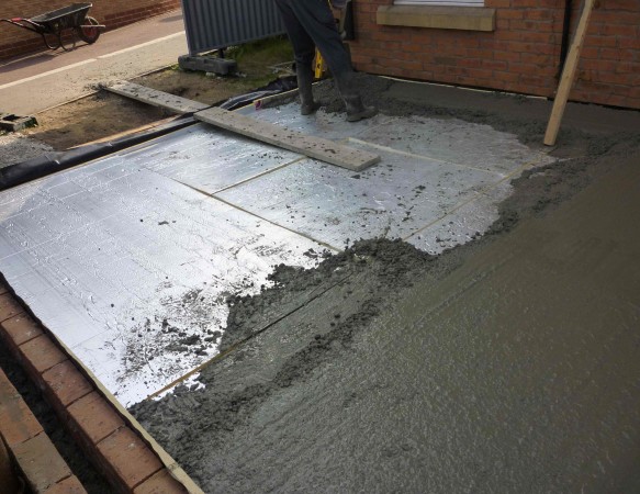 При укладке теплоизоляционного слоя поверх бетонного основания следует подбирать материал с максимально доступными для застройщика прочностными характеристиками. Чтобы выровнять основание, можно ограничиться укладкой плит различной толщины, однако лучшим вариантом считается создание ровной стяжки, которая скроет все неровности бетона, обеспечит максимально ровное положение плит, поэтому повысит их устойчивость к большим нагрузкам. При необходимости с помощью выравнивающей стяжки можно изменить угол наклона на несколько сантиметров.