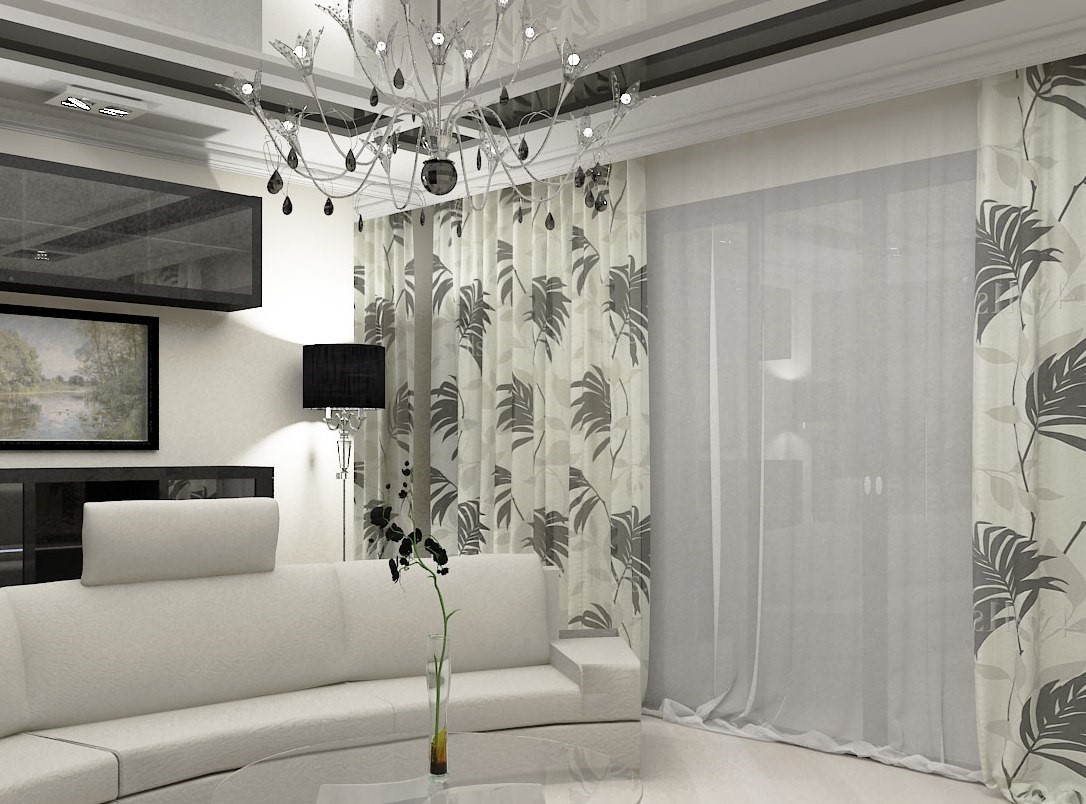 Тюль и шторы в гостиной на шторной ленте