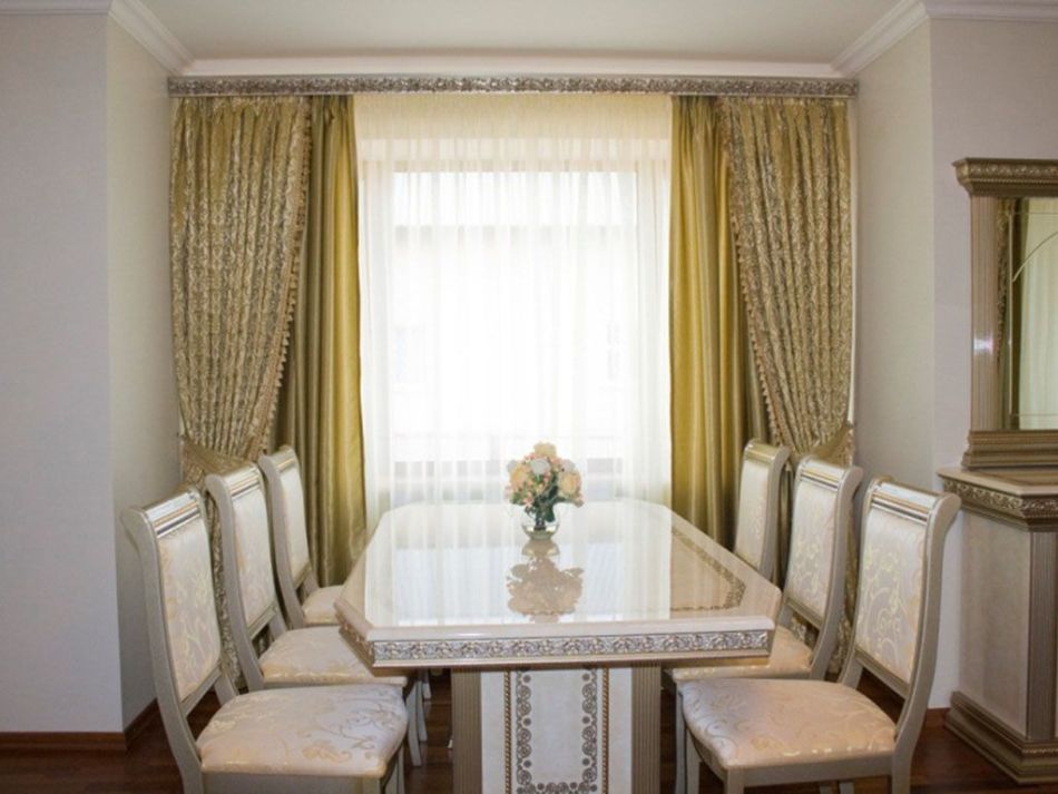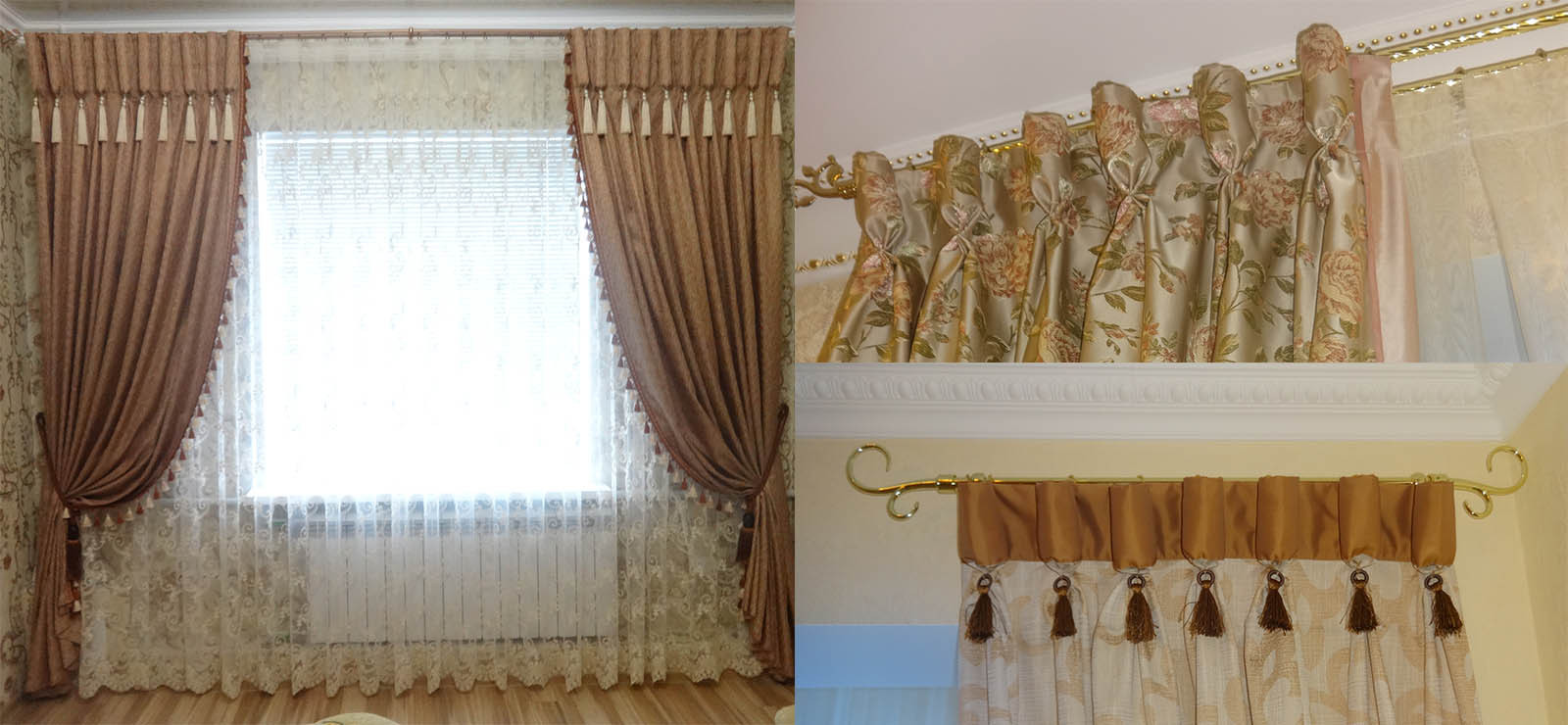Например, в большой гостиной можно повесить полотна из дорогой, плотной ткани, красивые, красиво при этом украсить их ламбрекеном, декоративными воланами и кистями.