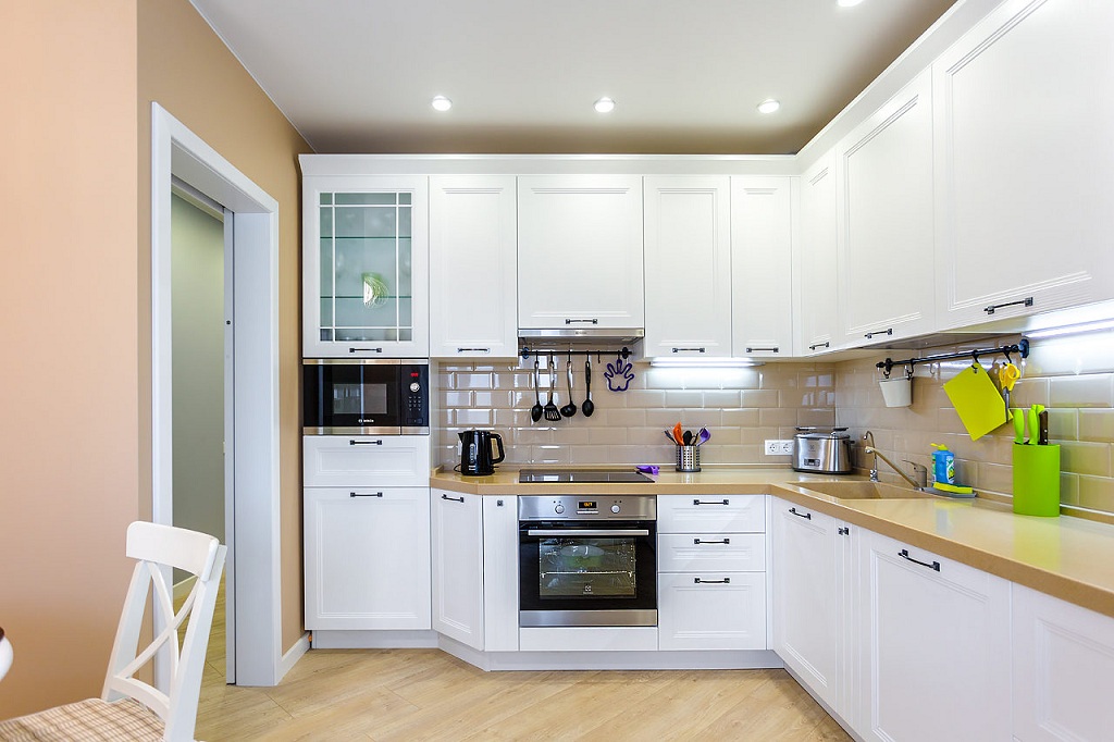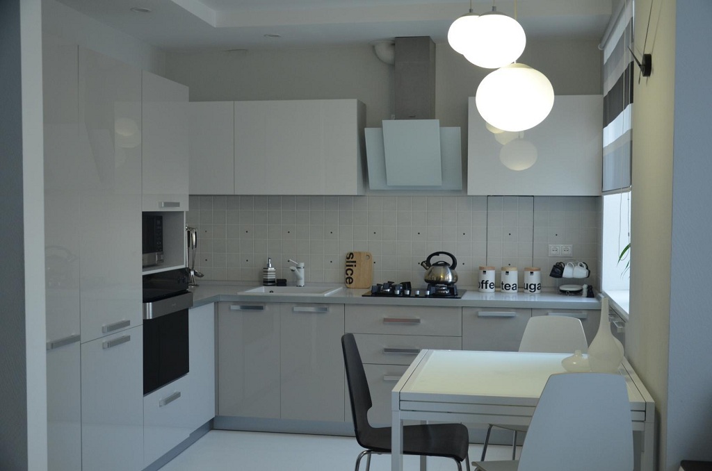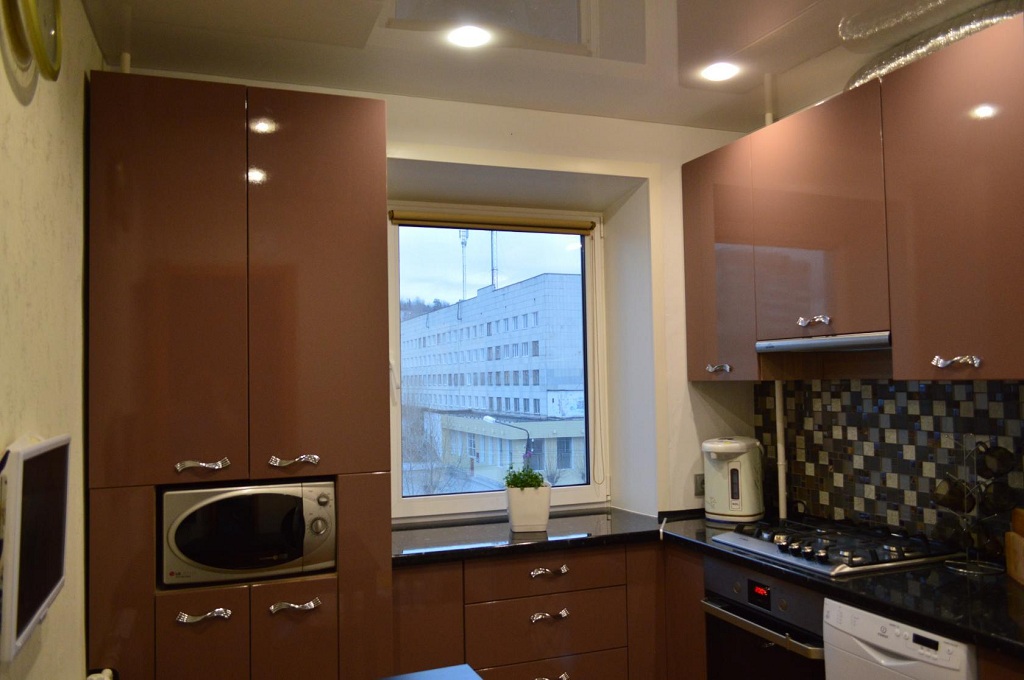 Очень важно, чтобы вся маленькая кухня была обустроена в белых тонах. Натяжной потолок на ней должен быть белым