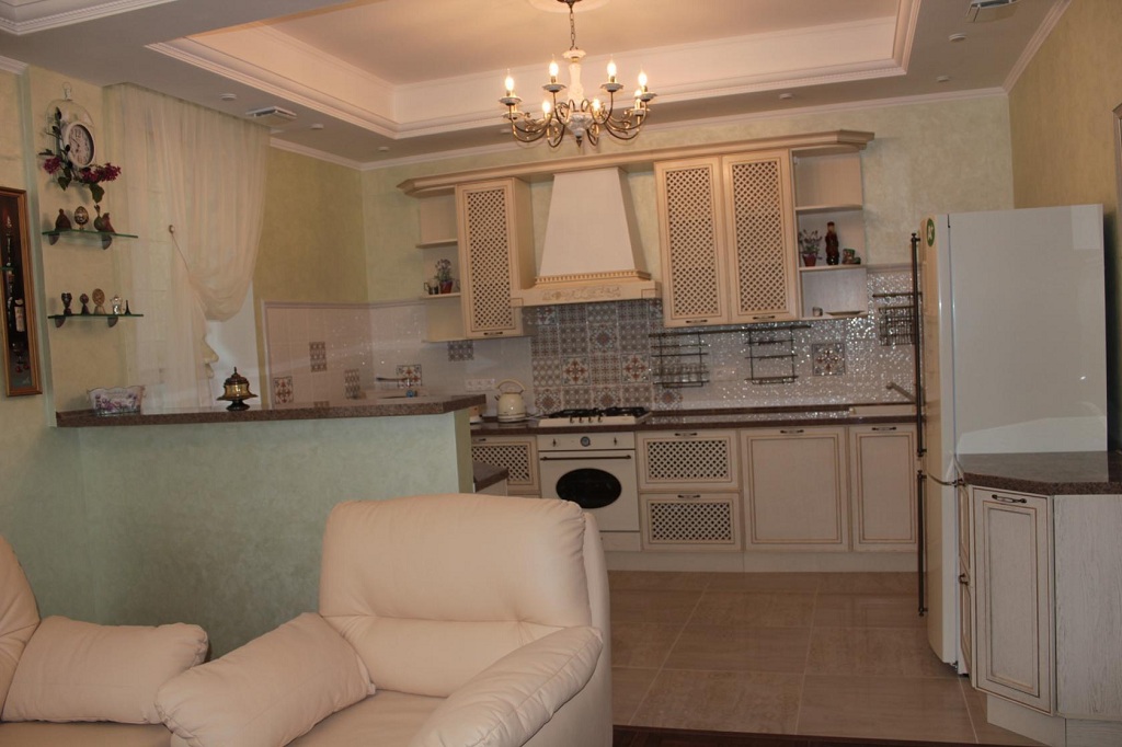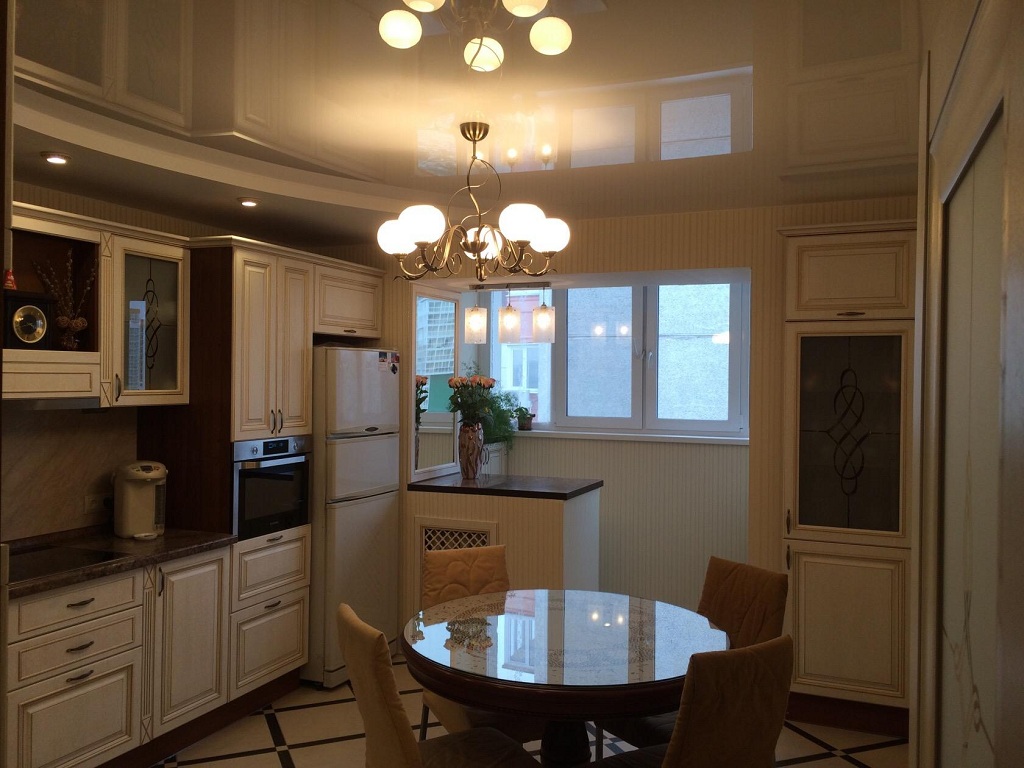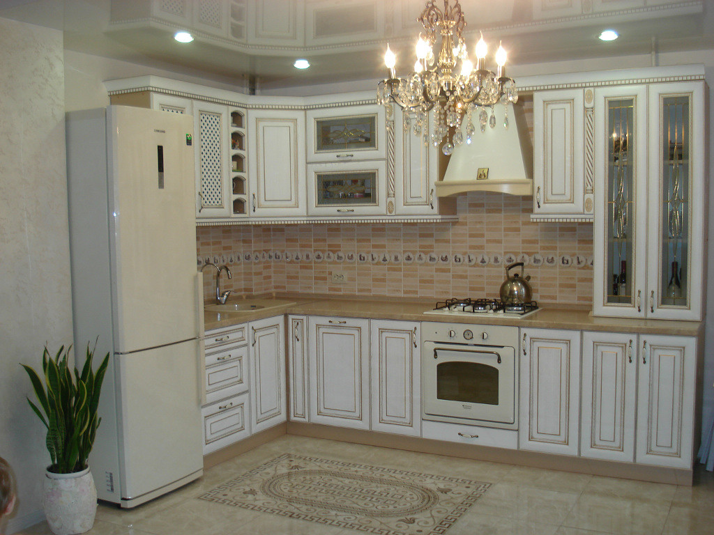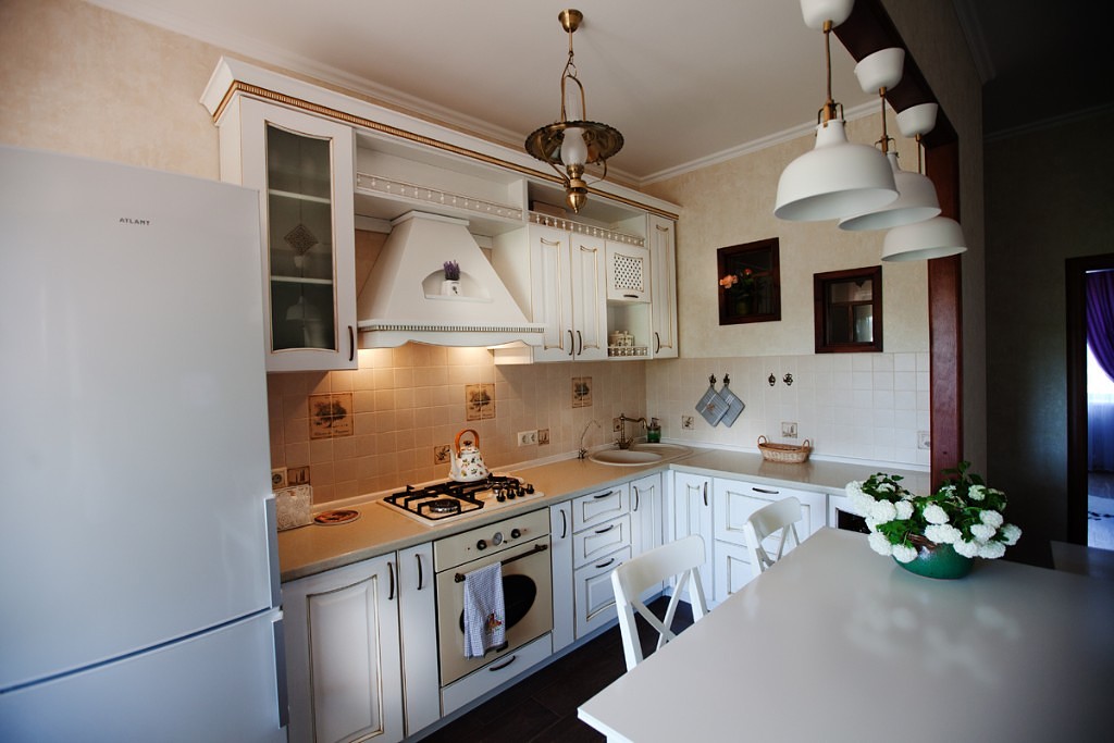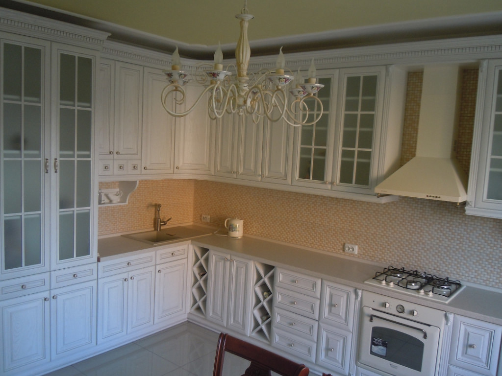 Кухня в классическом стиле – традиционным украшением такой комнаты станет подвесная люстра из хрусталя (помещение должно быть достаточно высоким), или же припотолочная стеклянная люстра в виде цветка.