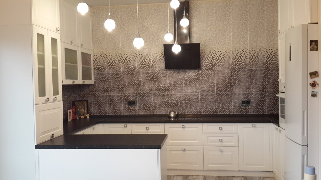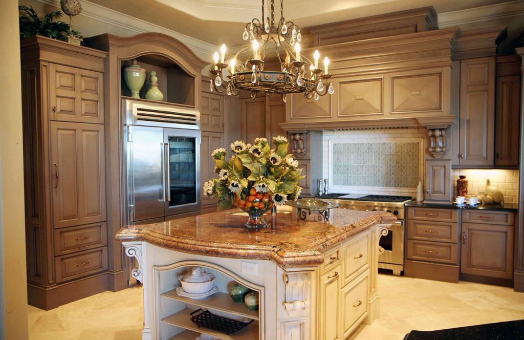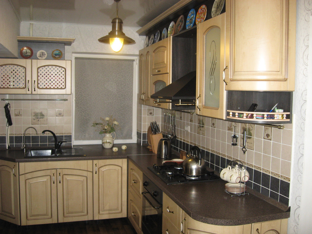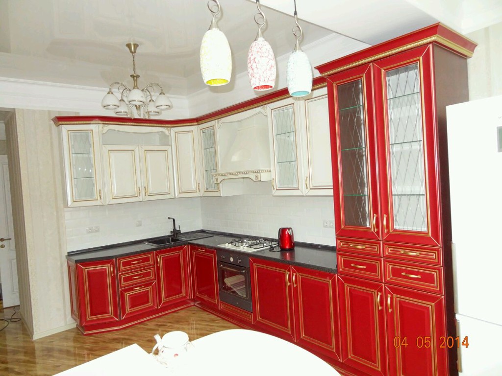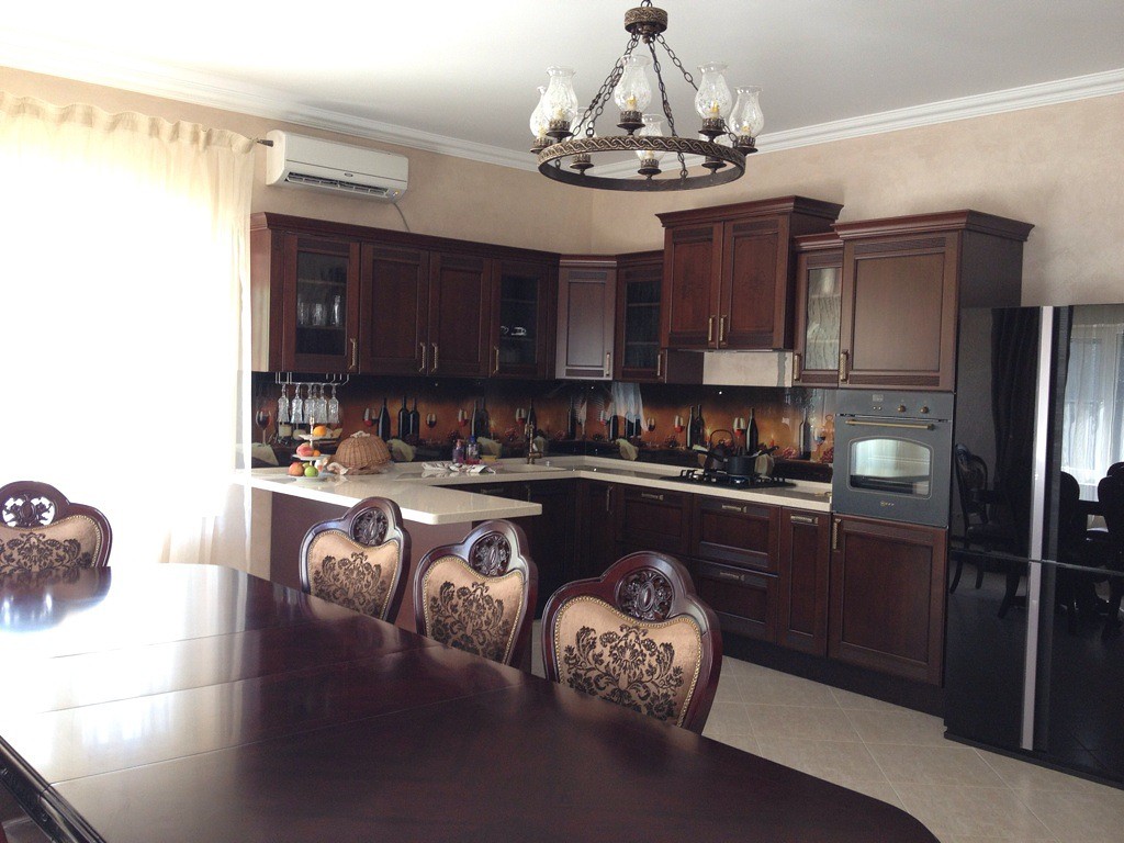 Кухня в классическом стиле – традиционным украшением такой комнаты станет подвесная люстра из хрусталя (помещение должно быть достаточно высоким), или же припотолочная стеклянная люстра в виде цветка.