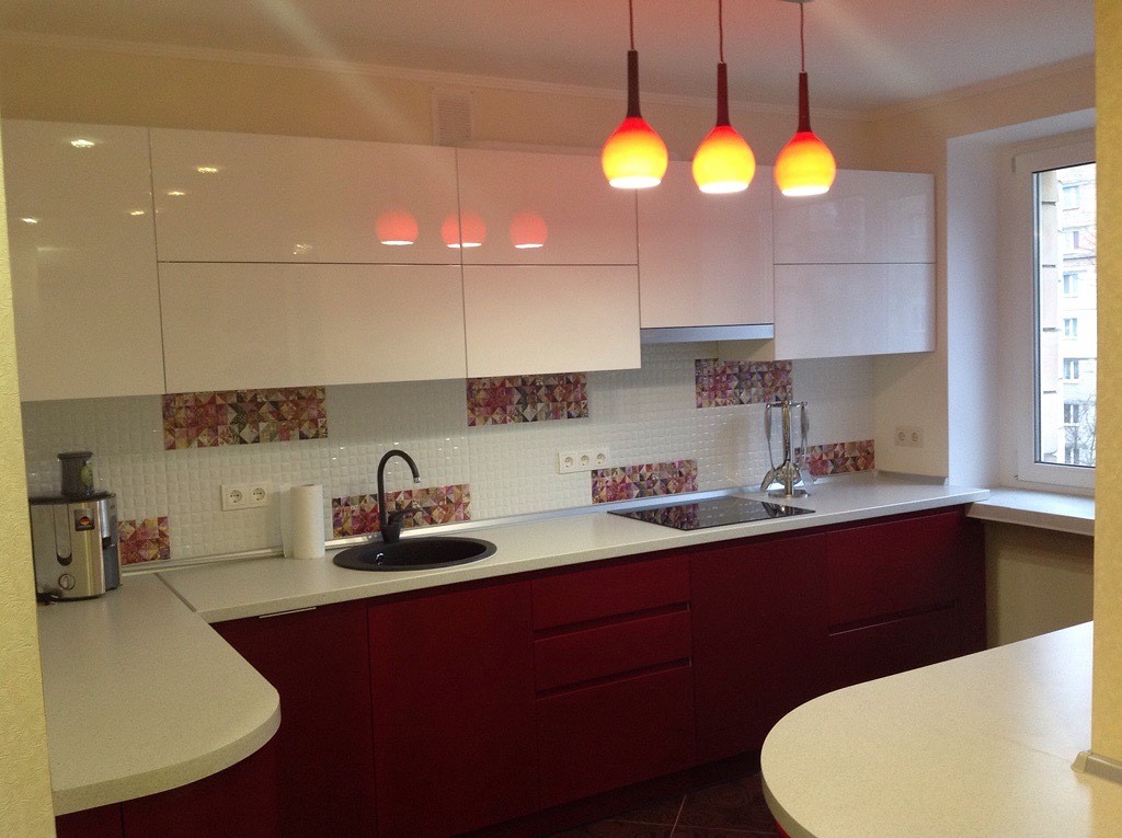 Кухня в стиле модерн – к ней можно подобрать подвесной светильник, выполненный из современных материалов (пластика, легкого металла, стекла). В данном случае можно проявлять всю свою фантазию. Люстра в кухню, обустроенную в стиле модерн, может быть подвесной или припотолочной, выполненной из самых разных материалов, иметь любую необычную форму и цвет.