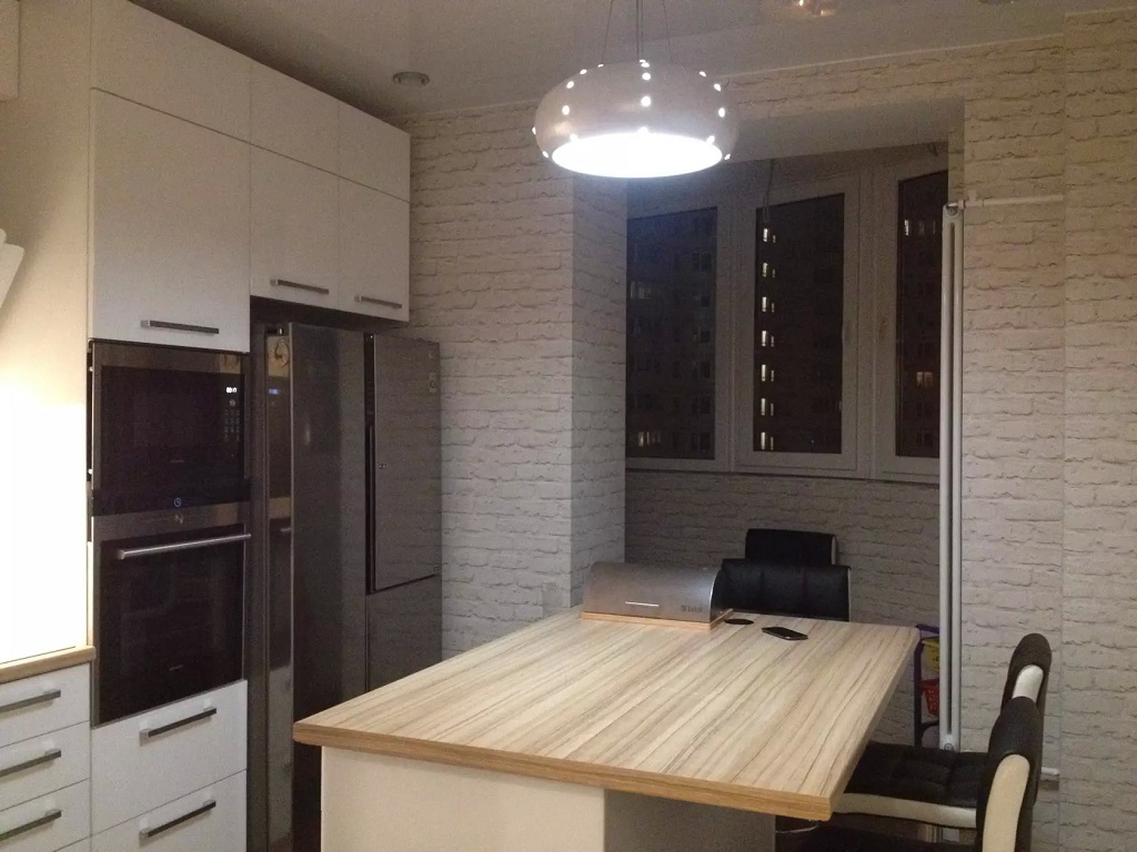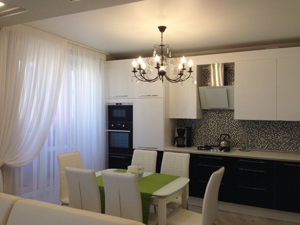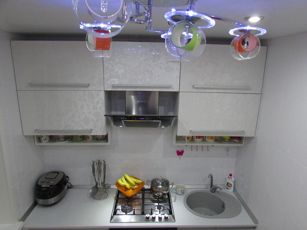В маленьком помещении с высокими потолками следует устанавливать высокие потолочные люстры. Припотолочные и подвесные конструкции будут крайне неуместны — они сделают кухню еще более громоздкой и тесной.