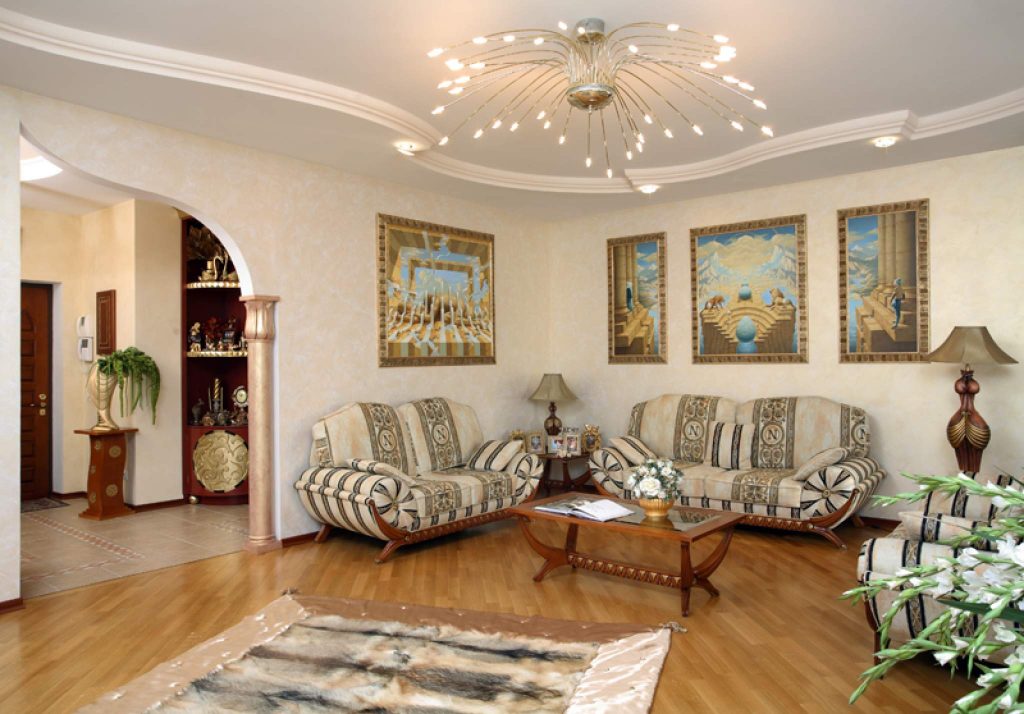 Если гостиная комната имеет высокие потолки (от 2,5 метров и выше), то здесь будет актуальным использовать многоуровневые виды люстр или на длинных канатах. Для стандартных квартир с низкими потолками такая люстра, естественно, будет смотреться не к месту. А значит, правильнее всего будет выбрать люстру небольшую, потолочную, которая будет иметь низкую посадку. Теперь стоит поговорить о стиле оформления самого интерьера и выбора люстр к нему.