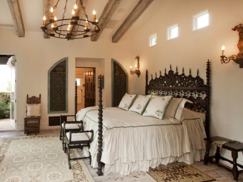 В современном интерьере спальни напольные торшеры прекрасно замещают настенные лампы. Их устанавливают у изголовья кровати, чтобы обеспечить умеренное освещение пространства для отдыха. Размещение при входе в комнату не практично, так как световой поток нужен в спальной зоне. Модели на высоких ножках, имеющие общее назначение, должны создавать рассеянное освещение. Низкие торшеры, устанавливаемые вместо настольных светильников на прикроватной тумбочке, лучше брать с направленным световым потоком.