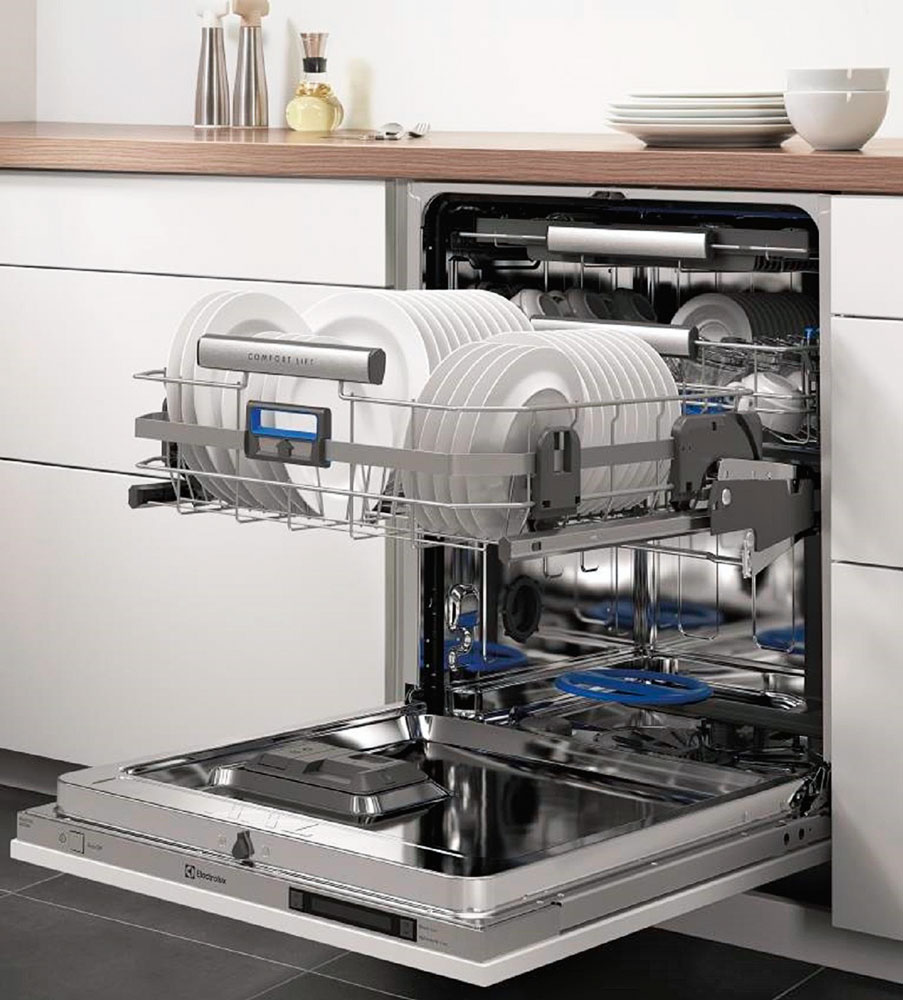 Зачем наклоняться? В моделях серии ComfortLift (Electrolux) выдвижной механизм нижней корзины дополнен подъёмным механизмом, который позволяет не нагибаться при загрузке и разгрузке посуды. Поэтому, выбирая технику, подумайте, какой тип посуды вы будете мыть чаще всего и какой вариант конструкции поддонов вам будет удобнее.