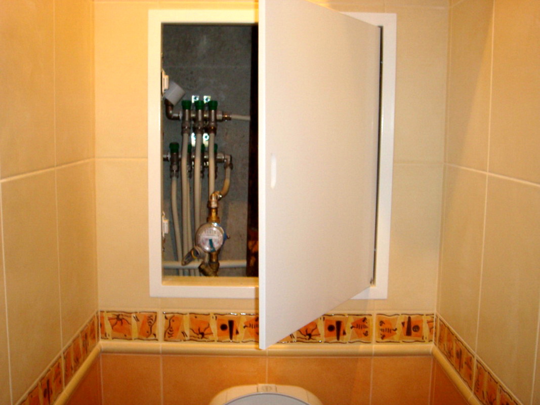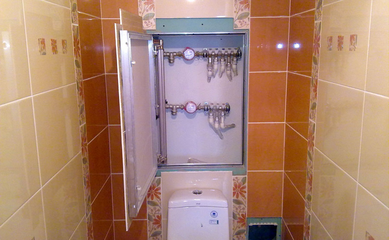 Сложности возникают, когда вместо пары ответвлений приходится скрывать приборы учета воды, требующие регулярного доступа, фильтры, коллекторы и пр.