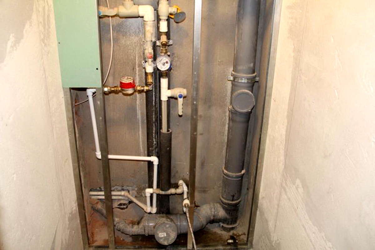 В типовом жилье все просто: в углу помещения проходит общий канализационный стояк, параллельно ему установлены трубы централизованного водоснабжения. К ним подключены внутриквартирные коммуникации из труб меньшего диаметра. Таким образом, в маскировке нуждается и вертикальный стояк, и горизонтально проложенные ветки.