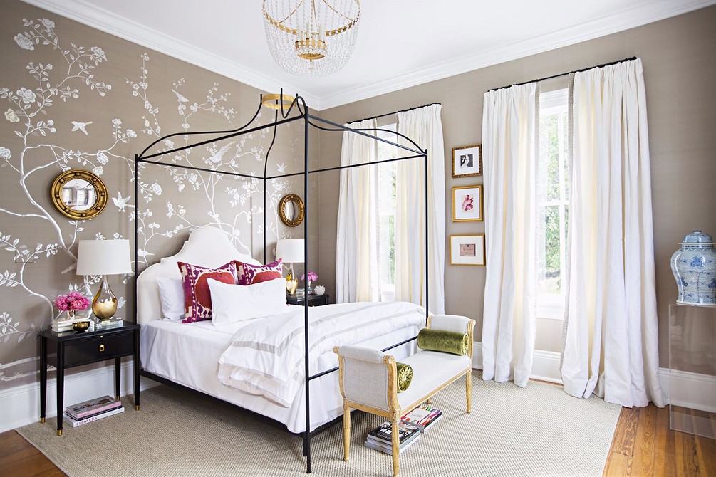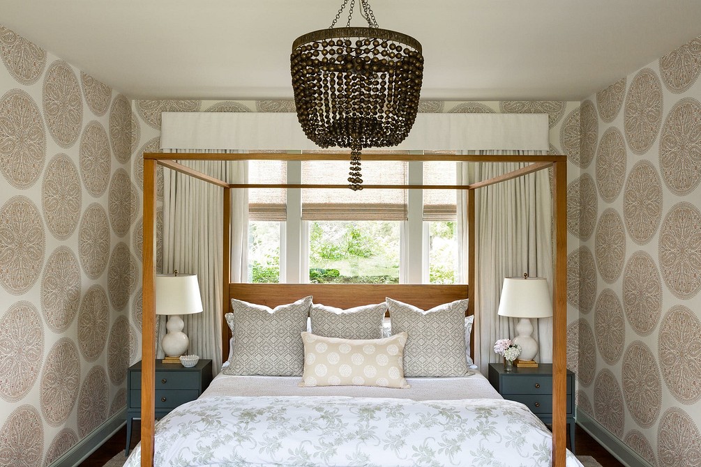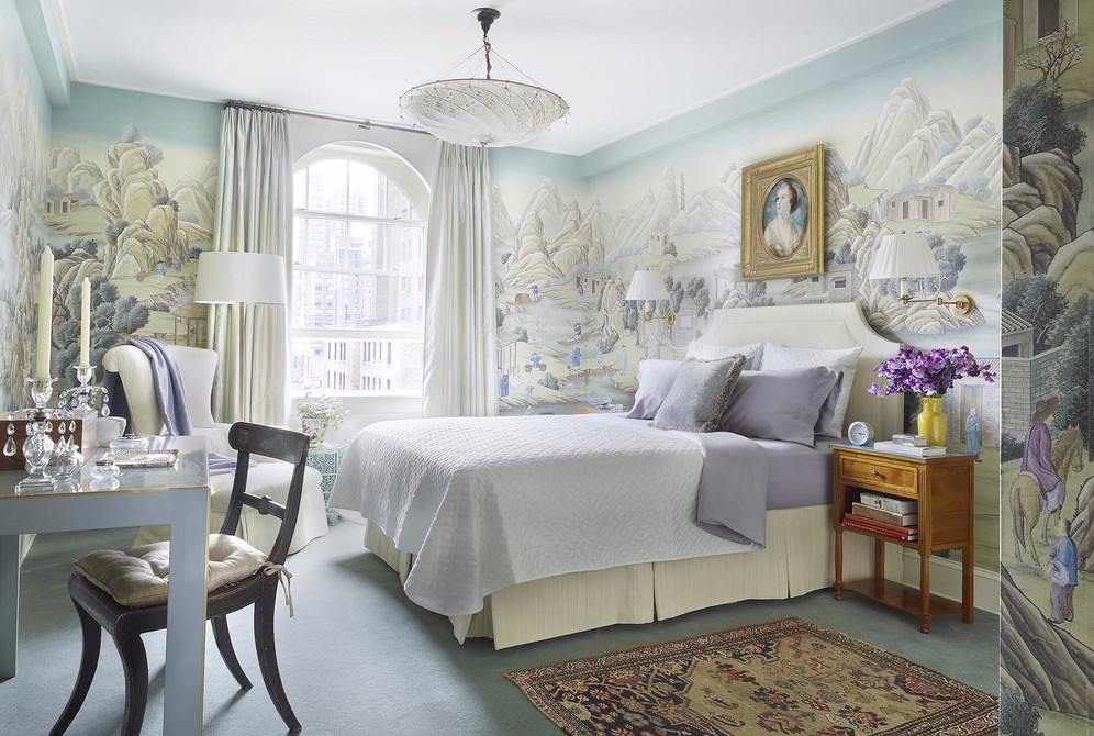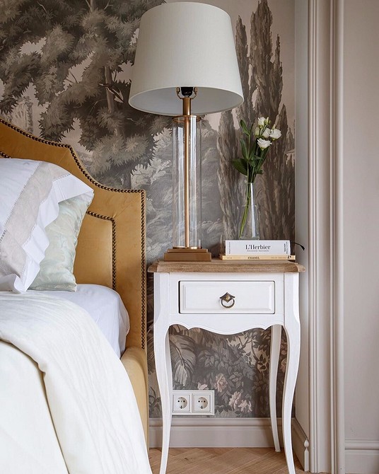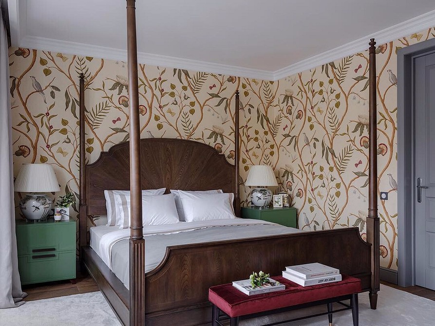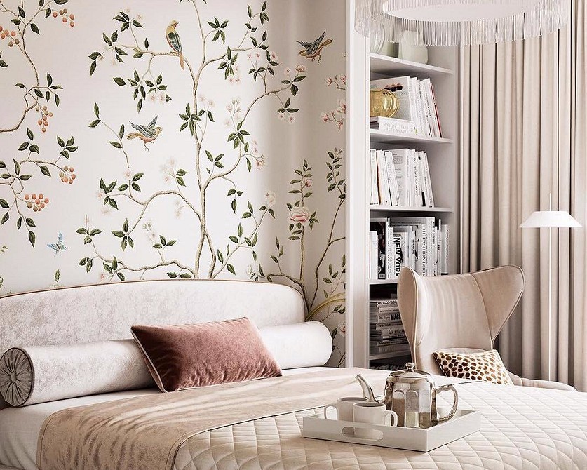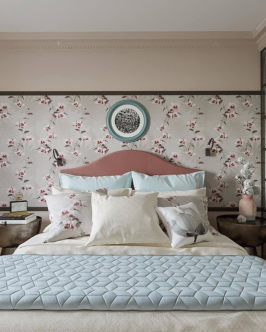 Чинц — это индийская хлопковая или льняная ткань с растительным или цветочным орнаментом на светлом фоне. Аналогично называется и принт. В последнее время дизайнеры всё чаще обращаются к этому узору как в оформлении акцентных стен, так и целых комнат. Нежные витиеватые рисунки подойдут в романтичные лёгкие интерьеры: кантри, прованс и эклектика. Причём первым двум чинц добавляет благородства и элегантности. На фото интерьеров спальни в 2020 году такие обои будут смотреться очень эффектно.