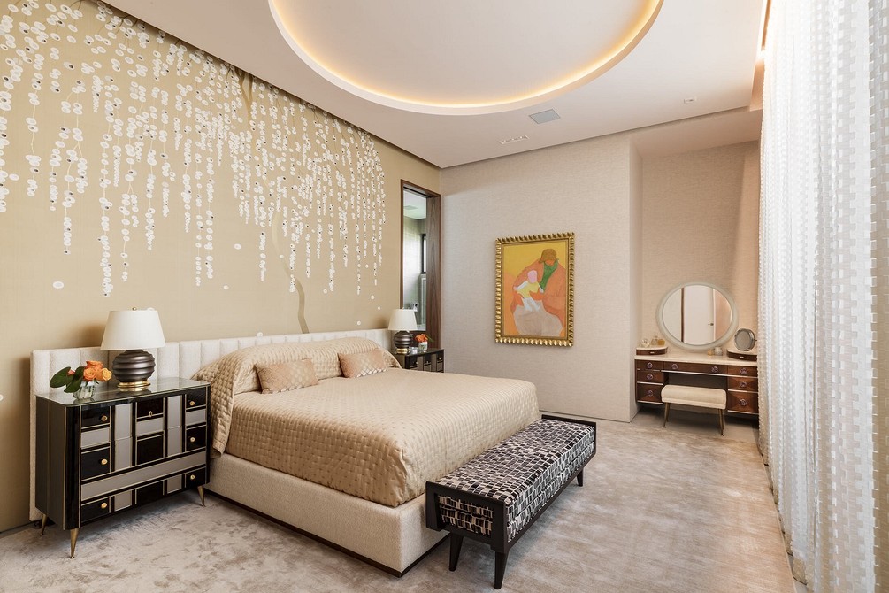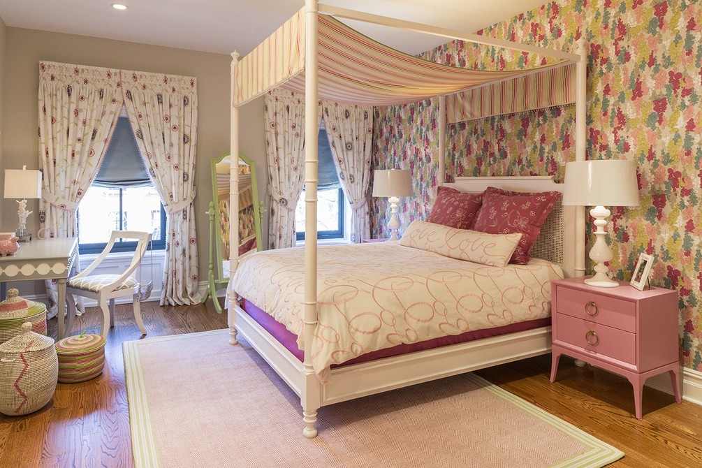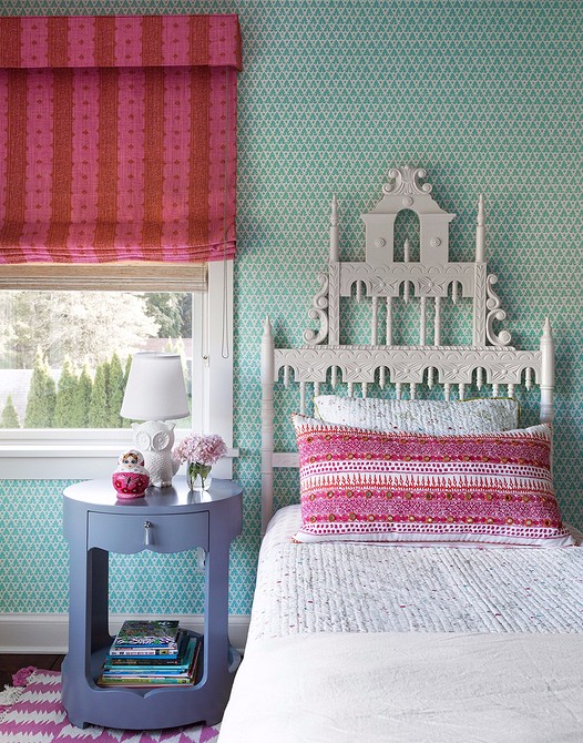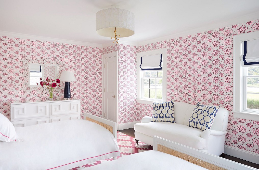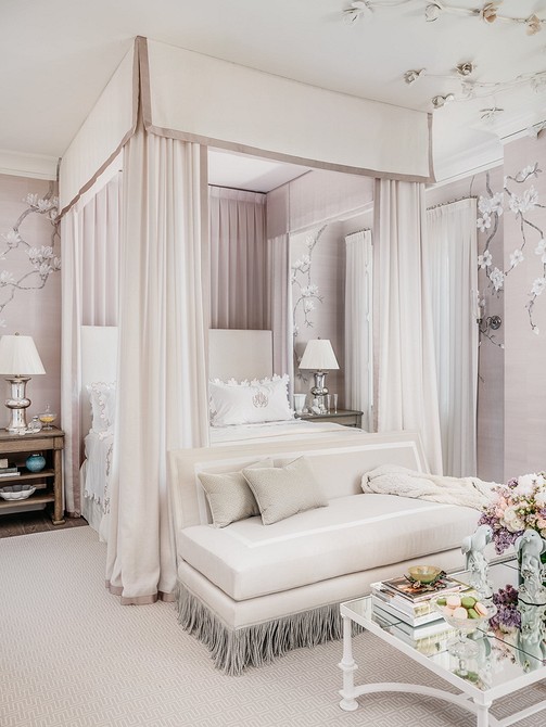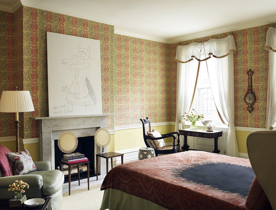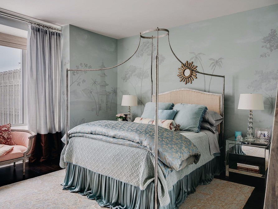 Чинц — это индийская хлопковая или льняная ткань с растительным или цветочным орнаментом на светлом фоне. Аналогично называется и принт. В последнее время дизайнеры всё чаще обращаются к этому узору как в оформлении акцентных стен, так и целых комнат. Нежные витиеватые рисунки подойдут в романтичные лёгкие интерьеры: кантри, прованс и эклектика. Причём первым двум чинц добавляет благородства и элегантности. На фото интерьеров спальни в 2020 году такие обои будут смотреться очень эффектно.