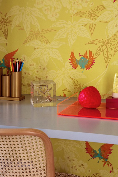 Кухня в проекте Марты Храпки. На стене — обои с тропическим принтом, Boussac