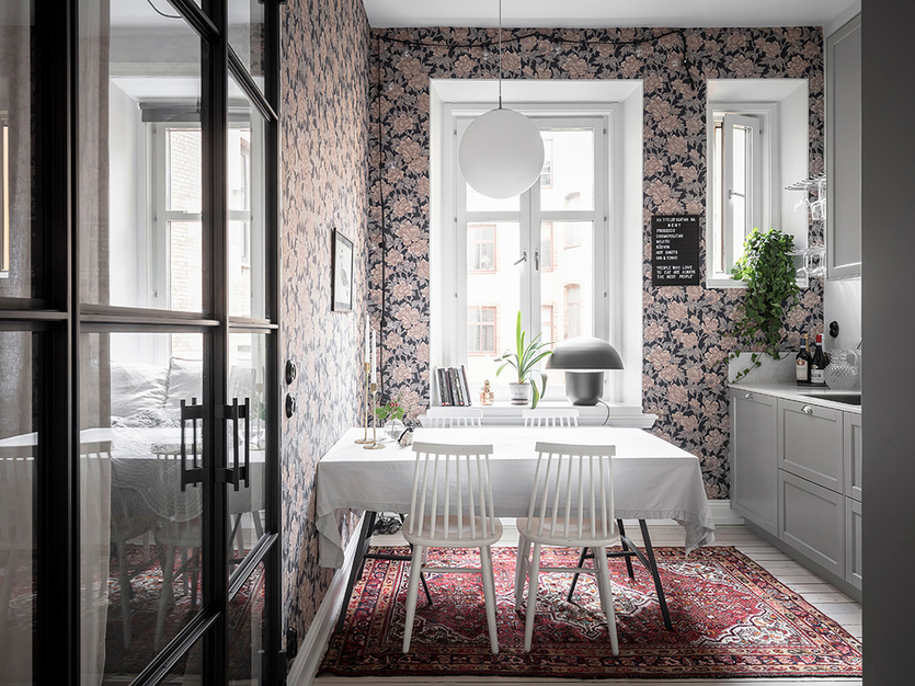 Обеденная зона выделялась с помощью обоев с крупными и яркими узорами или фотообоев с изобилием цветов.