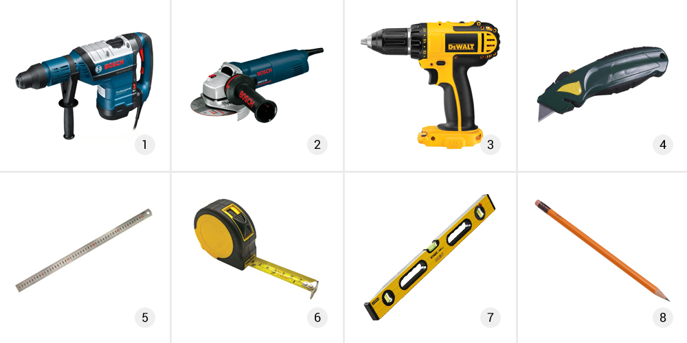 - Рулетка, строительный уровень, угольник, отбивочная нить, правило.