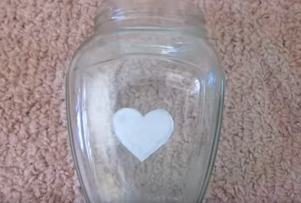 На малярном скотче рисуем сердце, вырезаем его и наклеиваем на середине стенки стеклянной посуды.