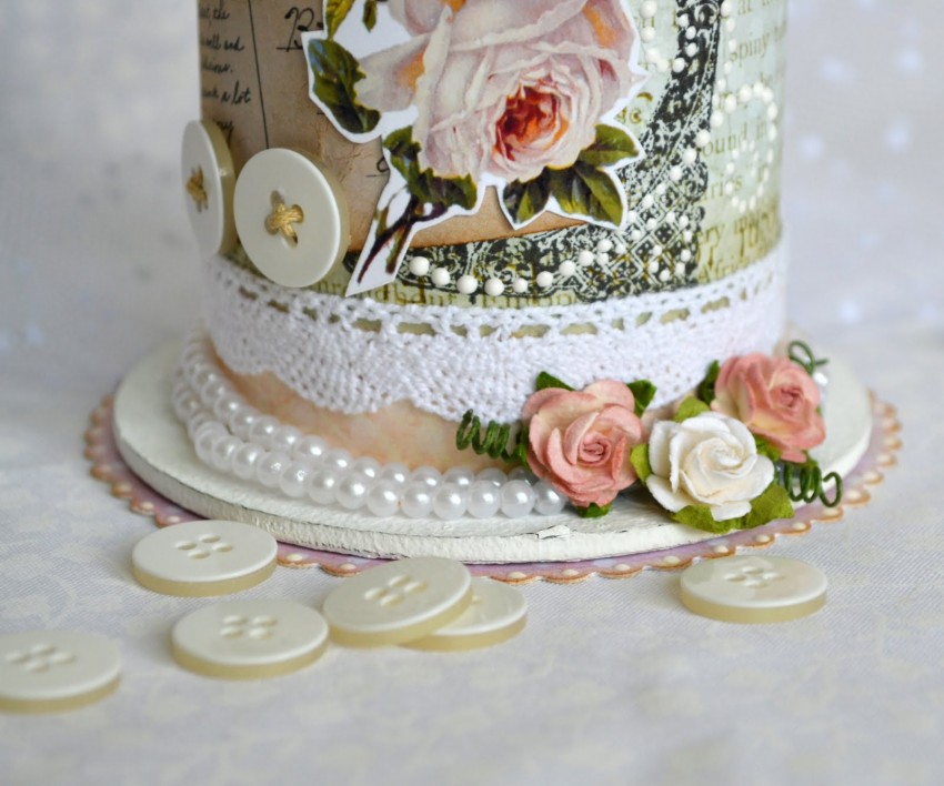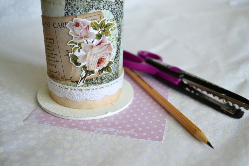 - Оклеить тубы с внешней стороны винтажными обоями либо тканью, можно выполнить декупаж. Украсить розами, кружевом, лентами, жемчужными бусинами.